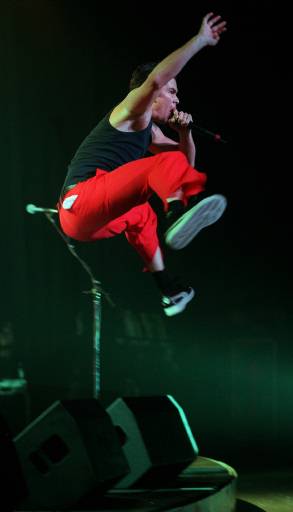 Mark McGrath of the rock band Sugar Ray leaps over the monitors during
