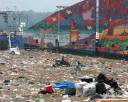 Trash fills the field in front of the east stage and the Peter Max facade at Woodstock '99, Monday morning July 26, 1999. What began with scattered